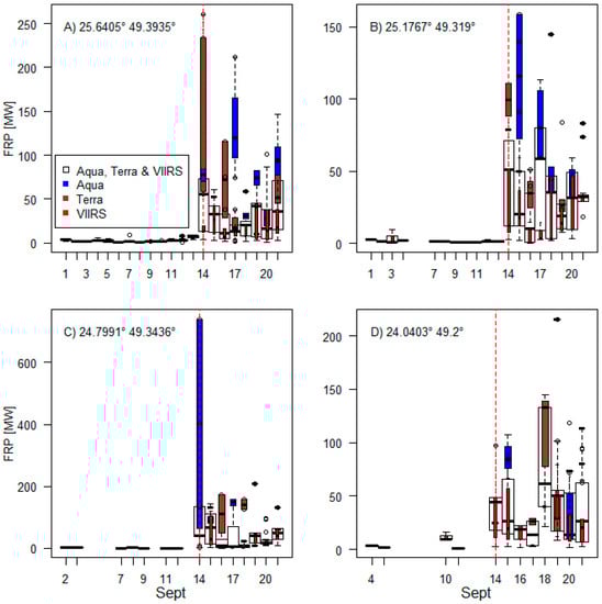 Hence, the smaller (375-m) pixel dimension of VIIRS has increased the probabilities of detection as compared to MODIS 1 km. FRP retrieved from both MODIS Aqua and Terra and VIIRS are summarized as box and whisker plots in Figure 3. A distinct increase in the FRP is seen after the 14th of September 2019 over all sites by all satellites as compared to pre-flare FRP, which is expected due to continued active flaring at least until the end of the study period, which was the 21st of September, 2019. It is also evident that the three satellite observations differ considerably over these four locations during the time of emergency flaring. Although the gas stacks themselves cover a small fraction of the MODIS and VIIRS pixels, flame size, atmospheric effects and sensor characteristics such as the point spread function can all influence the possibility of detections over multiple [] pixels for the same subpixel fire. Different sensors, overpass times, view angle and atmospheric effects can influence FRP retrievals.