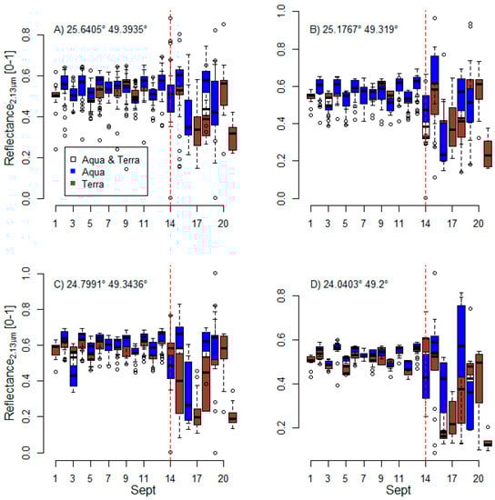 Time series of 2.13 μm (MODIS band 7) reflectance from MODIS Terra (brown) and Aqua (blue) platforms summarized as whisker plots for the four (A–D) flares illustrated in each frame of Figure 1. Central geographic coordinates are shown for each flare site illustrated in Figure 1 is also shown in each frame. The mean is boxed by the 75th and 25th percentiles. The vertical red dashed line marks the day of emergency flaring. Different satellites with different overpass times have similar reflectance before the day of flaring, while they are different and mostly lower after the day of emergency flaring. Central geographic coordinates shown for each flare illustrated in Figure 1 are also shown in each frame.