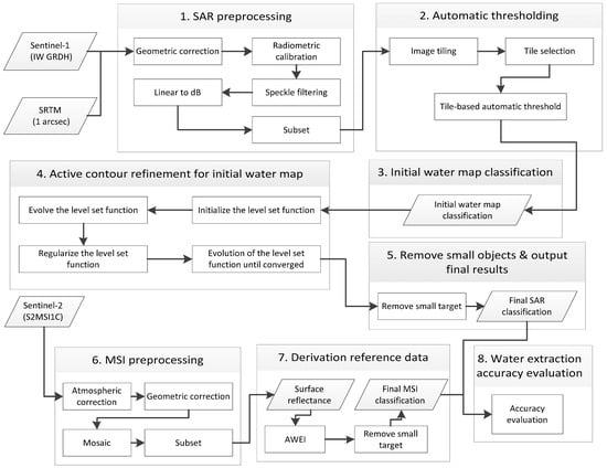 - Twele, A.; Cao, W.; Plank, S.; Martinis, S. Sentinel-1-based flood mapping: A fully automated processing chain. Int. J. Remote Sens. 2016, 37, 2990–3004. [Google Scholar] [CrossRef]