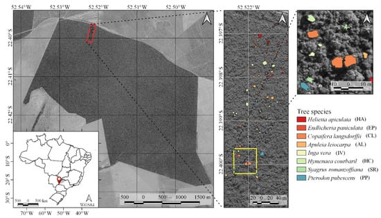Study area and tree species recognized in the field in the 2017 dataset. The red rectangle represents the imaged area, and the yellow rectangle is a zoom of the study area.