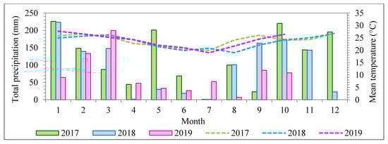The transect forest sample used in this study is centered at 22°23′55.21″S, 52°31′18.31″W, in the municipality of Euclides da Cunha Paulista, western part of São Paulo State, Brazil (Figure 1). The transect has an approximate length and width of 500 m × 130 m, and comprises a variety of tree species in different successional stages. The study area was established inside the Ponte Branca forest fragment, a protected area belonging to the Black Lion Tamarin Ecological Station. According to the Brazilian Institute for Geography and Statistics (IBGE), it is an area of the submontane, semideciduous seasonal forest []. The regional climate is considered a tropical zone with dry winters (Aw), according to the Köppen classification []. The mean temperature during the dry season is 21 °C, with less than 60 mm of total precipitation []. The weather patterns differed between the years 2017, 2018, and 2019 and the flight campaigns (Figure 2). The season was wetter in 2017, with precipitation of 69 mm before the flight campaign, whereas the precipitation was 18.6 mm before the flight campaign of 2018 and 51 mm before the flight campaign of 2019; however, rain did not occur for at least 8 days before image acquisition [].