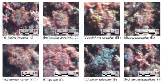 Canopy examples of each tree species identified in the field and delineated in the images acquired in 2017 (R: 780.49 nm; G: 565.10 nm; B: 506.22 nm; automatic contrast from QGIS software, version 3.0.0). (a) Apuleia leiocarpa (AP), (b) Copaifera langsdorffii (CL), (c) Endlicheria paniculata (EP), (d) Helietta apiculata (HA), (e) Hymenaea courbaril (HC), (f) Inga vera (IV), (g) Pterodon pubescens (PP), (h) Syagrus romanzoffiana (SR).