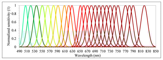 Hyperspectral images were acquired with a 2D-format camera based on the tunable Fabry–Pérot Interferometer (FPI) from Senop Ltd, model DT-0011 [,,]. The camera has two sensors, both of which have 1017 × 648 pixels with a pixel size of 5.5 µm. The total weight of the camera is around 700 g with its accessories, which include an irradiance sensor and a Global Positioning System (GPS) receiver. Spectral bands can be selected from the visible (VIS) to near-infrared (NIR) region (500–900 nm), which are acquired sequentially, i.e., the air gap of the FPI moves to acquire the different spectral bands of the same image. The spectral range of the first and second sensors are 647–900 nm and 500–635 nm, respectively. A total of 25 spectral bands were chosen, with the Full-Width at Half Maximum (FWHM) varying from 12.44 to 20.45 nm (Table 3 and Figure 4). For this spectral setting, each image cube needs 0.779 s to be acquired. The exposure time was set to 5 ms, and the image blocks were divided into two flight strips, ensuring more than 70% and 50% forward and side overlaps, respectively.