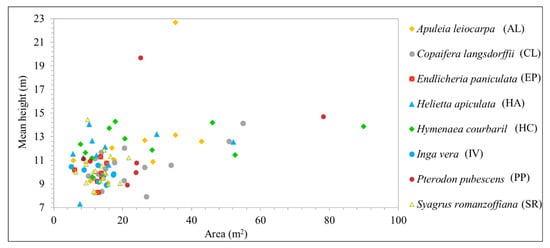 Mean tree height versus the tree crown area for all samples identified in the field. Data are from the 2017 dataset.