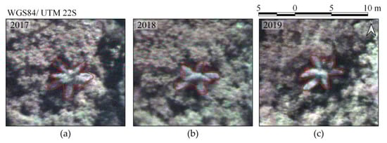 More than 25 tree species with a diameter at breast height (DBH) greater than 3.8 cm were detected during fieldwork []. Tree species were in different successional stages, with the northernmost part of the study area containing trees in the initial stage of succession and the southernmost in a more advanced stage []. Moreover, we located 90 trees of eight species that emerged from the canopy (Table 1 and Table 2). Their crowns were manually delineated through visual interpretation of RGB image composites of each dataset (R: 628.73 nm; G: 550.39 nm; B: 506.22 nm). Figure 1 shows examples of delineated individual tree crown (ITC) polygons in the 2017 dataset, and Figure 3 shows canopy examples of each tree species in the mosaic of images acquired during the 2017 flight campaign. These tree species were chosen because they are important for characterizing the successional stage of the forest, e.g., Syagrus romanzoffiana (SR), which can be associated with the faunal composition []. It is important to note that smaller tree species were excluded from analysis because the lianas that cover and mix among individuals negatively affect the classification accuracy. From now on, tree species will be called by their abbreviations from Table 1 and Table 2.