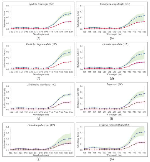 Values for each tree species considering the mean reflectance factor spectra (Mean) and the mean normalized spectra (MeanNorm) calculated using pixels in the delineated crown polygons. The blue line represents the Mean, the red line represents the MeanNorm, and the shaded area represents the minimum and maximum values. (a) Apuleia leiocarpa (AP), (b) Copaifera langsdorffii (CL), (c) Endlicheria paniculata (EP), (d) Helietta apiculata (HA), (e) Hymenaea courbaril (HC), (f) Inga vera (IV), (g) Pterodon pubescens (PP), (h) Syagrus romanzoffiana (SR).