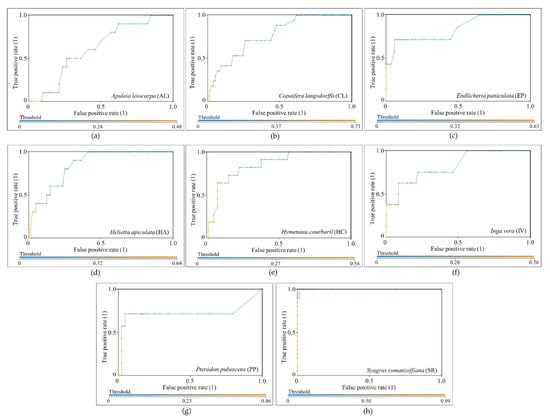 ROC curves of the identification of each tree species from the application of RF to all imagery datasets (Dall_MeanNorm). (a) Apuleia leiocarpa (AP), (b) Copaifera langsdorffii (CL), (c) Endlicheria paniculata (EP), (d) Helietta apiculata (HA), (e) Hymenaea courbaril (HC), (f) Inga vera (IV), (g) Pterodon pubescens (PP), (h) Syagrus romanzoffiana (SR).