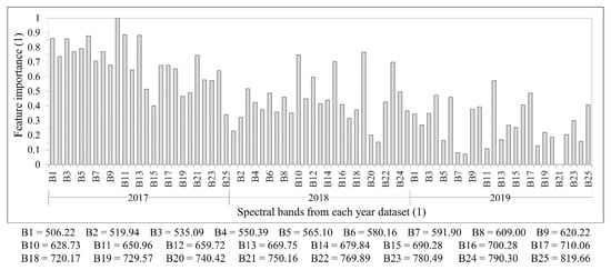 The feature importance in the Dall_MeanNorm dataset, which had the best classification results, is given in Figure 10. The feature importance was scaled from 0 to 1, where 0 represents the least important feature, and 1 represents the most important feature. The least important feature was band 21, centered at 750.16 nm, in the 2019 dataset, and the most important was band 10, centered at 628.73 nm, in the 2017 dataset. Additionally, in general, the most important features in the 2017 dataset were from the VIS part to the beginning of the red-edge part of the electromagnetic spectrum. In the 2018 dataset, an exception in feature importance may be observed at bands 15, 19, and 23, centered at 690.28 nm, 729.57 nm, and 780.49 nm. These bands were more important than most of the NIR bands in the 2018 dataset. In the 2019 dataset, bands 3, 6, and 12, centered at 535.09 nm, 580.16 nm, and 659.72 nm, respectively, were highlighted because of the peak in the feature importance value when compared with the other bands from 2019. These bands are in the VIS part of the electromagnetic spectrum; this is related to the leaves’ pigment, e.g., chlorophyll and carotenoids, content.