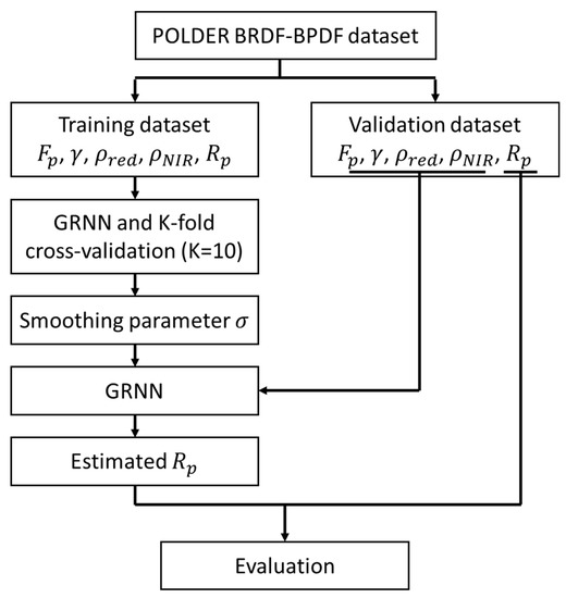 These models were compared by using data collected during the whole year, which included <600 targets for each IGBP class, as presented in Table 1. For a given IGBP class, the evaluation process for the GRNN-based BPDF model followed Figure 3. For the other six BPDF models, the training dataset was used for retrieving free parameters, whereas the validation dataset was adopted for evaluating the performance of these models using free parameters adjusted from the training dataset. The RMSE between measured and modeled polarized reflectance was used for comparison.