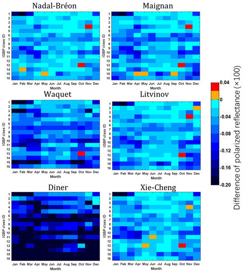 Figure 5 illustrates the difference between the RMSE obtained from the GRNN-based BPDF model and that from the other six models for 192 cases (i.e., for 16 IGBP classes and 12 months). The negative values mean that the RMSE obtained from the GRNN-based BPDF model was smaller than that from the compared model, indicating that the GRNN-based BPDF model was more accurate. As one can see from the top-left panel in Figure 5, the GRNN-based BPDF model was more accurate than the Nadal–Bréon model in 188 cases (out of 192 cases, 188/192 = 97.9%). In only four cases, the RMSE obtained from the Nadal–Bréon model was smaller than that from the GRNN-based BPDF model. Moreover, the difference was very small (less than 0.04%). Similar results were found when the GRNN-based BPDF model was compared to the Maignan, Waquet, Litvinov, Diner, and Xie–Cheng models (Figure 5), i.e., the GRNN-based BPDF model was more accurate in 187 (97.4%), 191 (99.5%), 189 (98.4%), 192 (100%), and 188 (97.9%) cases, respectively. These results confirm that the GRNN-based BPDF model is more accurate than the other models when using data collected during every single month.