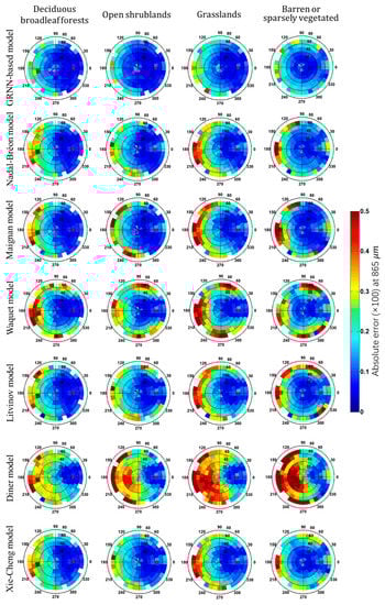 We also calculated the averaged RMSEs of 16 IGBP classes for each model, as presented in the last row of Table 2. The Nadal–Bréon, Maignan, Litivinov, and Xie–Cheng models are the best current models because they all achieve comparable and generally satisfactory average RMSE, i.e., 0.262%, 0.270%, 0.271%, and 0.268%, respectively. The Waquet and Diner models were the relatively worse performers, with an average RMSE equal to 0.301% and 0.418%, respectively. The GRNN-based BPDF model had the smallest average RMSE (0.227%). Compared to these best current models, the GRNN-based BPDF model reduced the average RMSE by >13.4% (= (0.262 − 0.227)/0.262). It is thus clear that the GRNN-based BPDF model performed best among these models using data collected during the whole year.