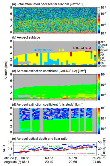 - Young, S.A.; Vaughan, M.A.; Garnier, A.; Tackett, J.L.; Lambeth, J.D.; Powell, K.A. Extinction and optical depth retrievals for CALIPSO’s Version 4 data release. Atmos. Meas. Technol. 2018, 11, 5701–5727. [Google Scholar] [CrossRef]