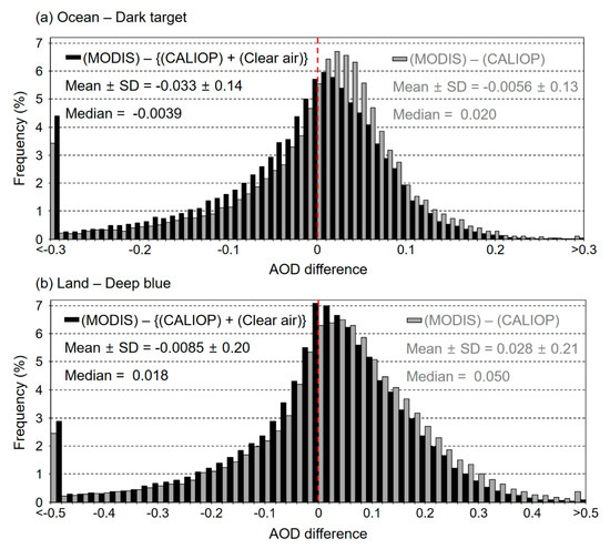 Frequency distribution of AOD difference between CALIOP and MODIS (gray bars) for dust layers used in this study from 2007 to 2011 (a) over ocean with MODIS DT AOD and (b) over land with MODIS DB AOD. Black bars represent the AOD difference including clear air AOD for CALIOP AOD. CALIOP AOD is from the CALIOP level 2 aerosol product and clear air AOD is retrieved in this study.
