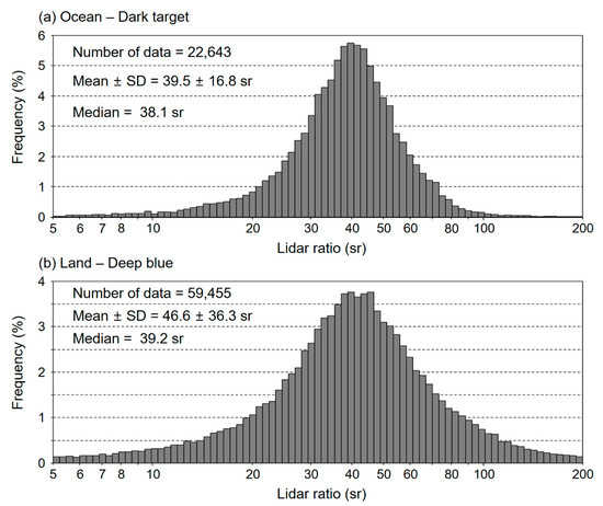 Figure 4 shows the frequency distribution of the retrieved dust lidar ratios over ocean and land after discarding data pairs with large AOD difference as described above. Note that the x-axis is a logarithm scale and the lidar ratios show a log-normal distribution centered (mode) at ~41 sr for ocean and ~43 sr for land. The mean (and SD) lidar ratios are 39.5 ± 16.8 sr and 46.6 ± 36.3 sr over ocean and over land. This is reliable because the lidar ratio of 44 sr for dust used in the CALIOP level 2 aerosol retrieval algorithm lies between these two values [18]. However, median values of 38.1 sr over ocean and 39.2 sr over land are smaller than mean values. Few values smaller than 5 sr and larger than 200 sr (0.8% over ocean and 2.8% over land) are omitted in Figure 4. However, we accept all values of the retrieved lidar ratio for mean and median, except for values less than 1 which is physically impossible, to avoid bias induced by arbitrary criteria for the retrieved lidar ratios.