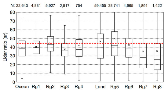 Box-whisker plots of retrieved lidar ratio over ocean, land and for regions shown in Figure 5. Boxes are for 50% percentile, bars and x-marks in each box are median and mean values, respectively. Red dashed line represents 44 sr that is used in the CALIOP version 4 aerosol retrieval algorithm. The number of data (N) is shown on the top.