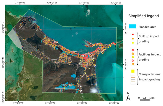 The eye of Hurricane Dorian reached the Bahamas on 1 September 2019 with maximum sustained winds of 297 km/h. Even if the Caribbean regularly experiences hurricanes, Dorian was qualified as the strongest event on record ever to hit the Bahamas. It impacted the region in different ways: extensive loss of vegetation (leaves and aerial parts burnt by the salt or stripped by the wind), damaged buildings and infrastructures, and large areas of flooding or submersion as a consequence of precipitation and sea level surge in the lower parts of the islands (WMO, World Meteorological Organization) [37]. The area is characterized by flat land and the absence of major rivers. The main risk of flooding is therefore related to marine submersion and rainwater.
