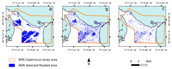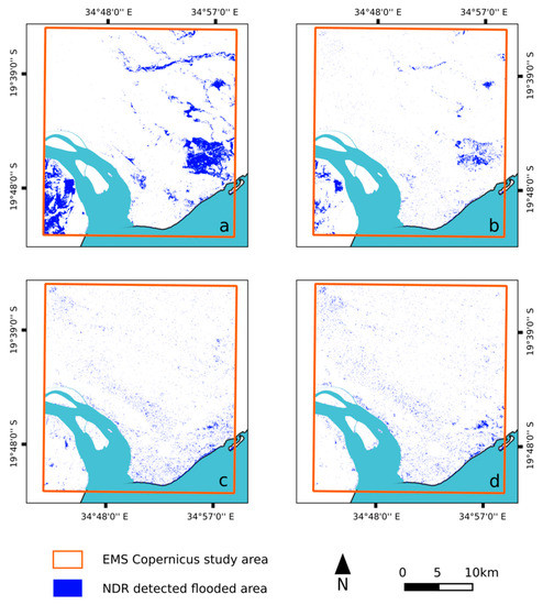 We applied the same threshold of −0.2 in the area. The difference between results from NDR and EMS mapping is less significant this time, with 75% of the EMS-detected flooded area detected by the NDR method.