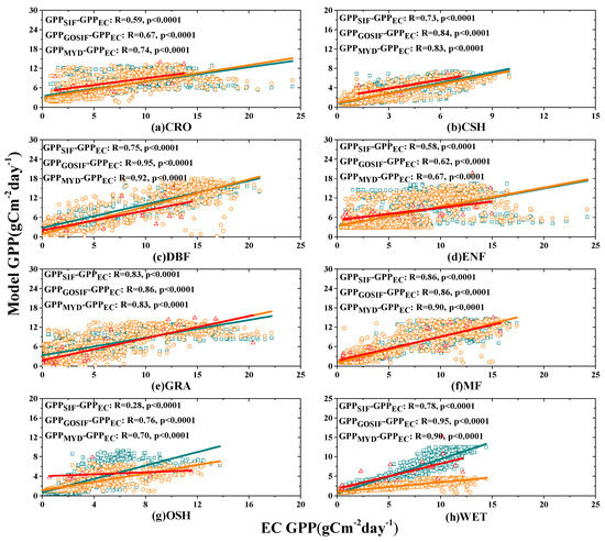 We used SIF757-GPPEC, GOSIF-GPPEC, and MYD-GPPEC models to estimate the GPP (GPPSIF, GPPGOSIF, and GPPMYD, respectively) for each vegetation type and then established linear correlation between GPPSIF, GPPGOSIF, GPPMYD, and GPPEC, as shown in Figure 2. On the whole, GPPGOSIF (R = 0.62–0.95, p < 0.001) was most strongly correlated with GPPEC, compared with GPPMYD (R = 0.67–0.92, p < 0.001) and GPPSIF (R = 0.28–0.86, p < 0.001). The amount of SIF757 is small, which directly leads to a poor performance of the GPPSIF-GPPEC model, especially for (g) open shrublands (OSH), for which only seven observations are available. Moreover, the insufficient accuracy of a small portion of OCO-2 SIF757 products is also responsible for the performance of the GPPSIF-GPPEC model. Referring to Table 3, an interesting phenomenon is worth noting, in that GPPMYD exhibits a poor correlation with GPPEC in terms of a single flux tower. However, a good correlation between GPPMYD and GPPEC was witnessed in terms of the vegetation type, as shown in Figure 3.