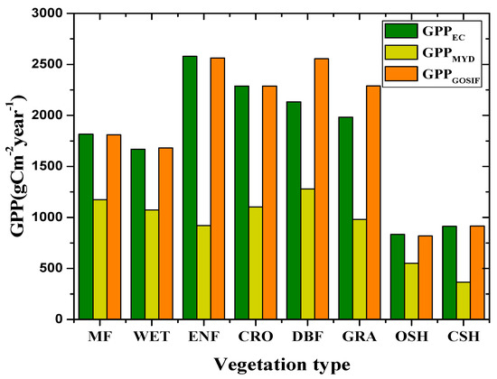 Figure 3 shows the annual average GPPEC, GPPMYD, and GPPGOSIF for different vegetation types. It can be concluded that the annual average GPP of evergreen needleleaf forests (ENF) is the highest, and that of OSH is the lowest. Compared with the annual average GPPMYD, the annual average GPPGOSIF is closer to the annual average GPPEC, which suggests that the accuracy of GOSIF-estimated GPP is higher than that of MODIS GPP. It is worth noting that GOSIF overestimates GPP for deciduous broadleaf forests (DBF) and grasslands (GRA), implying that there is still necessary work to be done before estimating the GPP of those vegetation types using GOSIF datasets. On the contrary, MODIS GPP underestimated the GPP of eight vegetation types. In particular, for ENF and closed shrublands (CSH), more than half of the GPP values were underestimated by MODIS GPP. MODIS GPP has a long time series and can thus be used to observe changes in the vegetation coverage of long-term series. However, it is not suitable for quantitatively calculating carbon fluxes. The reason GPPSIF is not shown in Figure 3 is that the data volume of SIF757 is too small. For most flux towers, the data volume of SIF757 is about 20 from 2014 to 2018. Because OCO-2 has sparse overpasses globally and short time series [19], we cannot calculate the annual average of GPPSIF by using SIF757-GPPEC model.