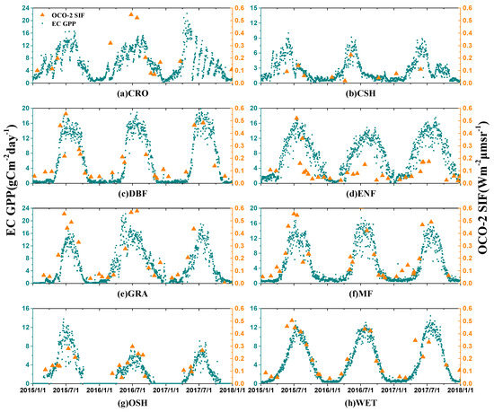 The seasonal trends of tower GPP and SIF757 from January 1, 2015 to January 1, 2017, for different vegetation types: (a) CRO, (b) CSH, (c) DBF, (d) ENF, (e) GRA, (f) MF, (g) OSH, and (h) WET. The dot indicates flux tower GPP measurements, and the triangle indicates OCO-2 SIF757 data.