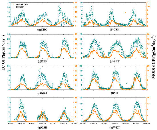 The seasonal cycle of GPPEC and MODIS GPP (MYD17A2H) for different vegetation types is shown in Figure 5. On the whole, the trends of MODIS GPP and GPPEC are similar for eight vegetation types. However, MODIS GPP significantly underestimated GPP for (a) CRO, (b) CSH, (c) DBF, (d) ENF, (e) GRA, (f) MF, and (h) WET. This is because the LUEP of these eight vegetation types is set too low in the LUE model, resulting in the low MODIS GPP value of the final estimate. Only for (g) OSH was the MODIS GPP value close to GPPEC in 2016 and 2017. It can also be seen in Figure 5 that the MODIS GPP fluctuates greatly after reaching its peak in summer, especially for (c) CSH, (f) MF, and (g) OSH. MODIS GPP reaches its peak in February 2015 for (e) GRA and (h) WET, suggesting erroneous seasonal cycles of MODIS GPP products. However, MODIS GPP has a longer time series than OCO-2 SIF. MYD17A2H can thus be used to monitor changes in the vegetation cover.