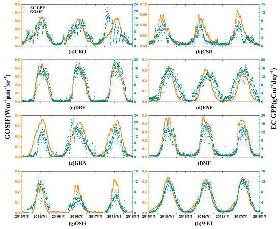 We also evaluated seasonal cycles of GPPEC and GOSIF data for each vegetation type from 2015 to 2017, as shown in Figure 6. The seasonal cycle of GOSIF was the most consistent with GPPEC in all three datasets, verifying the conclusion that the linear correlation between GOSIF and GPPEC is the highest. Especially for (c) DBF, (f) MF, and (g) OSH, the seasonal trend of GOSIF is exactly consistent with that of GPPEC. However, the advanced seasonal cycle of (e) GRA and (h) WET and lagged seasonal cycle of (b) CSH suggest significant errors in GOSIF data for those vegetation types. However, there may be errors in the GPPEC data of (a) CRO in 2017, which led to the low coincidence of seasonal cycles of GOSIF.