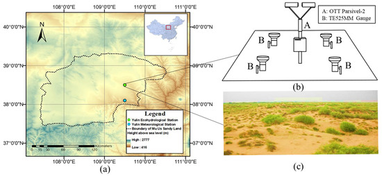 (a) The location of Yulin Ecohydrological Station (green point) and the location of Yulin Meteorological Station (blue point) and the DEM (Digital Elevation Model) characteristics around the sites. The red rectangle in the China map highlights the location of Mu Us Sandy Land; (b) the OTT Parsivel-2 disdrometer and the surrounding 4 TE525MM rain gauges in Yulin Ecohydrological Station; (c) vegetation cover situation in Yulin Ecohydrological Station.