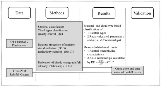Figure 1a shows the location of Yulin Ecohydrological Station and Yulin Meteorological Station. One OTT Parsivel-2 Disdrometer was placed in Yulin Ecohydrological Station, and continuously recorded data during a 1-year period between 10 August 2018 and 10 August 2019. There are also four TE525MM rainfall gauges placed at the same location (shown in Figure 1b), and the specific placement of the disdrometer and the four gauges is proposed by Xie et al. [25], providing a reference for the measurement data by the disdrometer. Data were recorded every 30 min during the researching period, with the four gauges recording data simultaneously and individually. The disdrometer conducted a 54 cm2 laser beam to record the rainfall spectrum every 1 min. The record of the disdrometer includes two parts: raindrop diameters (D) and raindrop terminal velocity (v). When precipitation particles pass the laser beam of the sensor, the beam is blocked off by the particles equal to the diameters, and the output voltage will be reduced. If there is no particle passing through, the voltage will then be recorded as maximum. The duration of the reducing signal will be used to determine the terminal speed of a particle. Through the observation by the disdrometer, radar reflectivity (Z), rainfall intensity (R) and kinetic energy (KE) are derived from D and v. Figure 2 summarizes how the materials and methods and results are managed via a schematic.