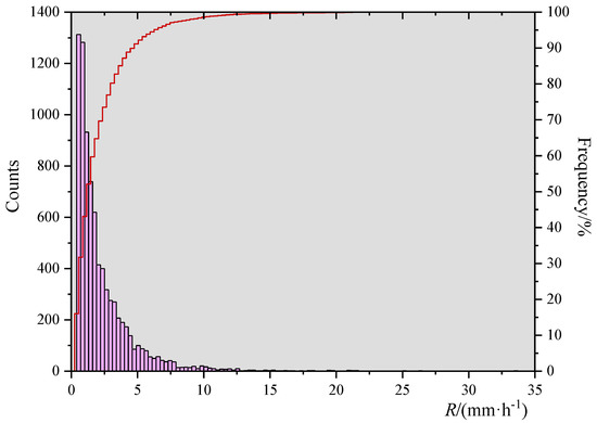 The quality control principle is similar to the method used by Li et al. [36]. For an instantaneous moment during a rainfall event, if the rain intensity R within the time range [] is > 5 mm/h and the standard deviation is >1.5 mm/h, the event is classified as a convective rainfall event; if the rain intensity R within the time range [] satisfies 0.5 < R < 5 mm/h and the standard deviation is <1.5 mm/h, then the event is classified as a stratiform rainfall event. Other rainfall events are classified as mixed-cloud rain [37].