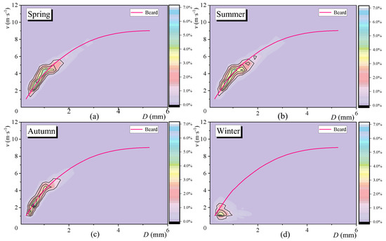 Figure 5 is the distribution of different diameters with varying velocities obtained in different seasons. In spring, summer and autumn, the majority of raindrop particles are in an area close to the theoretical curve proposed by Beard [45]; in winter, the data is accumulated in low levels of both v and D. Data are overall lying over the theoretical curve in spring, summer and autumn; in winter, however, the velocities are underestimated compared to the theoretical curve in winter. This is because the type of rainfalls during winter was mainly snow (regarded as solid rainfalls) and could cause deviation in call speed, and the raindrop data with D > 6 mm are excluded as shown in Section 2.3.