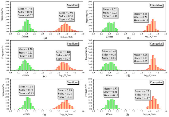 Frequency histogram of mass-weighted median diameter Dm and the denary logarithm of Nw in different precipitation types and different seasons calculated from the data measured by OTT Parsivel-2. (a) Histogram in stratiform rain in spring; (b) Histogram in convective rain in spring; (c) Histogram in stratiform rain in summer; (d) Histogram in convective rain in summer; (e) Histogram in stratiform rain in autumn; (f) Histogram in convective rain in autumn. The average value, standard deviation and skewness are also given for Dm and Nw in each plot.