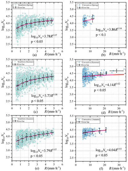 Nw-R relationships for different precipitation types in different seasons. The fitted power formula based on the least-squares method is also shown in each plot: (a) stratiform rain in spring; (b) convective rain in spring; (c) stratiform rain in summer; (d) convective rain in summer; (e) stratiform rain in autumn (f) convective rain in autumn.