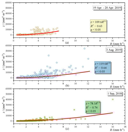 Z-R relationships () in three rainfall events. Each rainfall event is selected from different seasons (spring, summer and autumn). (a) Z-R relationship of a rainfall event in spring, from 19 April to 20 April 2019; (b) Z-R relationship of a rainfall event in summer, on 3 August 2019; (c) Z-R relationship of a rainfall event in autumn, on 1 September 2018; the fitted curves are derived based on the power function, which are solid red curves in (a–c).