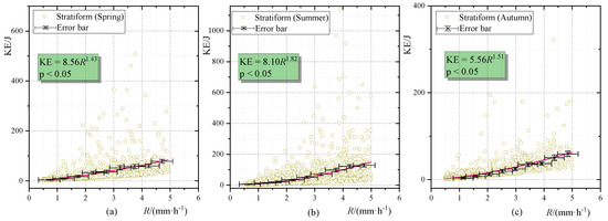 KE-R curves fitted in different seasons. Data of stratiform rain in spring, summer, and autumn are analyzed. (a) KE-R relationship in spring; (b) KE-R relationship in summer; (c) KE-R relationship in autumn. For the error bars in each panel, R in the range (0.5, 5) are divided into nine intervals evenly, and error bars are used for each interval. The error bars for each interval are based on the mean value of R and KE, with the ±1 Stdev (standard deviation), respectively.