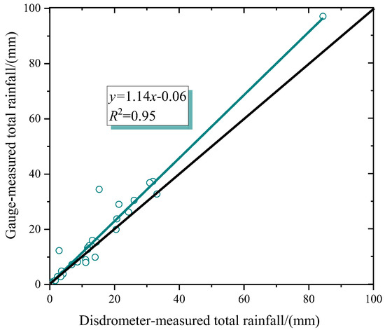 Scatter plot of gauge- and disdrometer-measured total rainfall on a daily scale. The results obtained by the two measurement methods are compared with the scatter plot. The solid green line is the fitted result.