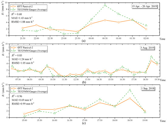 The measuring range of Parsivel-2 is 0.25–6 mm, and it has been proved that the disdrometer has errors in measuring both smaller and larger diameters of raindrops in many studies [53,54], which have more accuracy in measuring mid-level raindrops in the spectra. Liu et al. [54] further explained the algorithm of the disdrometer and concluded that the differences can be attributed to a certain error of rainfall amount accumulation. In all three measured events, when the TE525MM Gauges-measured data reaches its peak (at 0:30 in (a), 19:00 in (b), and 18:30 in (c)), the data measured by gauges are all more than the disdrometer-measured data; and when the TE525MM Gauges-measured data reaches its minimum of the event (at 23:30 in (a), at 11:30 in (b) and 15:00 in (c)), the data measured by gauges are all no more than the disdrometer-measured data. As raindrop spectra data larger than 6 mm are treated as solid rainfall and eliminated, the peak value of the disdrometer is lessened. This is consistent with the results in Section 3.3 that in Event 1 the disdrometer- and gauge-measured data indicates a significant gap (2.94 and 3.51 mm·h−1, respectively). Since the measured raindrop spectra data larger than 6 mm have been removed, and raindrops of large diameter are often accompanied by heavy rain [25], it is speculated that this is the reason why the peak of rainfall intensity obtained by the raindrop disdrometer is smaller than the value measured by rain gauges.
