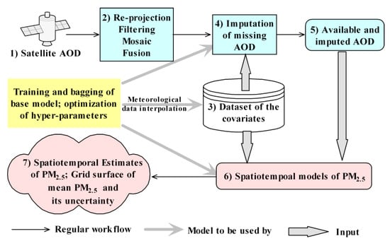 Bagging of residual base models (Figure 2 for the base model; Figure 1 for bagging framework) was developed as the core approach for the imputation of satellite AOD and estimation of PM2.5 at high spatiotemporal resolution. Figure 3 presents a workflow graph with the box in yellow indicating the core bagging method. The following seven paragraphs briefly describe specific steps of this workflow.