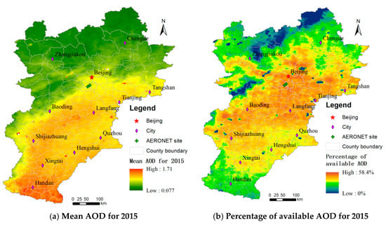 Statistics ((a) mean AOD; (b) percentage of available AOD) for 2015 MAIAC AOD of the study region.