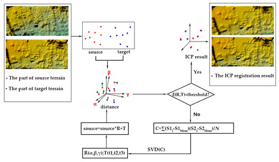 Ideally, the terrain variation in the two periods can be calculated and analysed on the basis of the aforementioned procedure as long as both point sets are correctly georeferenced. However, the deviation in the horizontal and vertical coordinate frames between the two point sets occurs because of inaccurate positioning and variation in the vertical direction [27,29,30]. If not addressed properly, the deviation could seriously affect the results of topographical change analysis. To address the problem, we applied the ICP algorithm to transfer the two point sets acquired by different sensors into the same common coordinate system. Figure 1 shows the basic flow of the ICP algorithm.