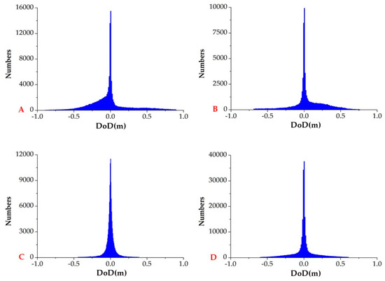 Similar patterns were also revealed by the histograms of the DoD values. As shown in Figure 7, evident bathymetry variations are presented in regions A and B. Specifically, the heavy tail in the left hand side of the histogram indicates a general erosion pattern in region A. On the contrary, region B is shown to have a significant deposition pattern, while for regions C and D, the histograms were generally symmetrical, and are similar to the standard normal distribution.