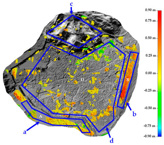 Spatial distribution of topographical changes in the ancient town.