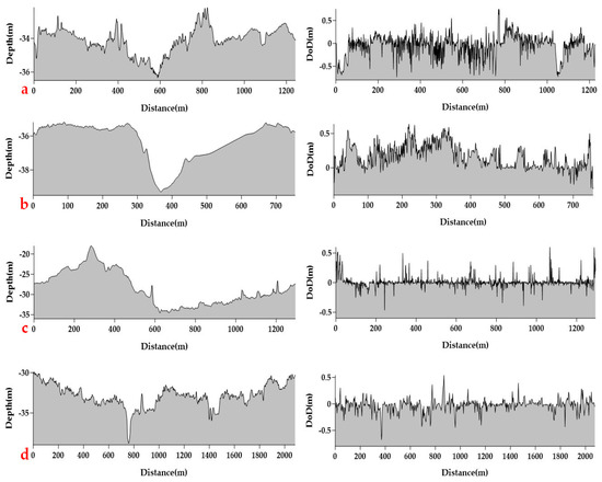 On the basis of robust estimation, the specific areas experiencing topographical changes were detected. First, the variances of the DoD in the local sliding window were calculated. Second, the confidence level of the DoD was set to 99.7% to identify the areas with significant bathymetry variations. Figure 8 shows the spatial distribution of the identified topographical variations. In region A, a mix of erosion and light deposition was observed. The deposition was predominant in region B, and an increasing tendency was revealed along the wall. On the contrary, few topographical changes were observed in regions C and D. To better illustrate the bathymetry variation pattern, four representative profiles are shown for their DoD and bathymetry information (Figure 9).
