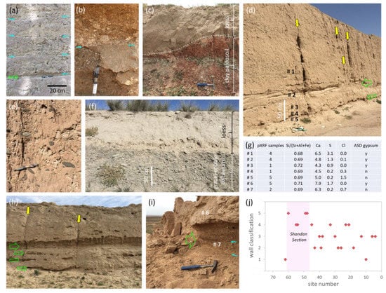 Field site photos and data. (a) Twenty-centimeter-wide layering of the Ming earthen wall (cyan arrows) at Site 48 (38°19.33′N; 101°58.25′E. (b) Abundant white clay-carbonate fragments within “hangtu” construction layers at Site 28 (37°56.29′N; 107°13.49′E). (c) A recently exposed cutting <1 km from Site 28 exposing a ~1 m thick surface layer of loess developed over an eroded red and white horizontal layered clay-rich paleosol with white clay-carbonate fragments. (d) South-side view of the well-preserved earthen wall at Site 48 (38°19.33′N; 101°58.25′E). Preferentially eroding “hangtu” layers are shown by green arrows while sub-vertical rills are shown by yellow arrows. Field sampling points for pXRF and ASD measurements are numbered (#). (e) Close-up view at Site 48 showing isolated, sub-rounded grey siltstone pebbles and cobbles in a beige colored loess matrix. (f) A road cutting along the Shandan section (38°27.40′N; 101°27.53′E) showing a ~1 m thick surface layer of loess developed over grey, sub-rounded, siltstone pebbles, and cobbles similar to those evident in (e). (g) A table of field pXRF chemistry and ASD gypsum information of selected sample points (#) in (d,i). (h) Preferential erosion along multiple “hangtu” layers at Site 33 (38°16.34′N; 106°32.18′E). (i) Recent collapse of the earthen wall at Site 38 (37°57.34′N; 105°47.78′E) related to undercutting along a ~50 cm wide erosional zone (#7) rich in halite. (j) Visual classification of the earthen wall’s erosional status where: 1 = little remaining of the original wall above the exposed land surface; and 5 = well-preserved wall, including the remnants of battlements. The magenta box highlights the well-preserved Shandan section.
