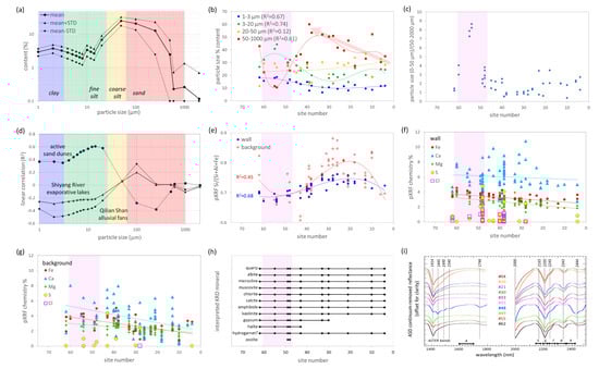 Laboratory analyses of field samples. (a) Scattergram of the mean (n = 43) and standard deviation (STD) for each of the 19 particle size bins. Four populations are highlighted: 0.1–3.0 µm (blue box) with a peak at 2 µm and called “clay”; 3–20 µm (green box) with a peak at 10 µm and called “fine-silt”; 20–50 (yellow box) with a peak at 50 µm called “coarse silt”; and 50–2000 µm (red box) and called “sand”. (b) Scattergram of the west-to-east pattern in mean particle size content for each of the four groupings. (c) Scattergram of the west-to-east spatial trend in the combined clay and fine-silt fractions (<20 µm) normalized with respect to sand (>50 µm) content. (d) Scattergram of the particle-size bin versus the fitted linear correlation (R2, n = 43) between a sample site’s given particle size content and its distance to one of three potential source areas, i.e., sand dunes, Tengger Desert evaporative lakes, and Qilian Shan alluvial fans. (e) Scattergram of the west-to-east pattern for field site portable XRF measurements of Si/(Si + Al + Fe) for both wall and background samples. (f) Scattergram of the west-to-east pattern of field site portable XRF measurements of Fe, Ca, Mg, S, and Cl of wall samples. (g) Scattergram of the west-to-east spatial trend of field site portable XRF measurements of Fe, Ca, Mg, S, and Cl of background samples. (h) East-to-west pattern of minerals detected using XRD. A magenta box highlights the well-preserved “Shandan” wall section. (i) Selected field ASD spectra. Diagnostic mineral absorptions are highlighted as well as the ASTER band-passes.
