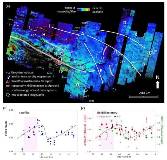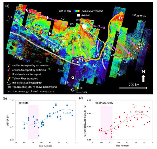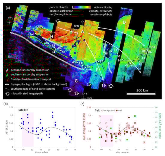 Based on the principles of mineral spectroscopy [], we processed the calibrated ASTER imagery [] to generate a suite of thematic mineral mapping products at ~30 m pixel resolution for an area of ~60,000 km2 spanning the 1200 km section of Ming earthen wall between Shenmu and Jiayuguan (Figure 1a). We focused here on five essential mineral components of loess, namely quartz-sand, white-mica (muscovite and illite), chlorite (as well as carbonate), gypsum and kaolinite, as these are measurable at ASTER’s spectral resolution [,,,]. Field data (optical spectra as well as other geochemical, mineralogical, and particle size measurements) from 21 sites along the Ming earthen wall were collected to provide both validation of the satellite maps as well as information about the compositional homogeneity/heterogeneity of the wall building material and any relationships with local (<100 m) surface materials.