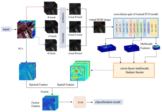Aiming at the above problems, this paper proposes a multiscale deep spatial feature extraction using a virtual RGB image method (MDSFV). Hyperspectral images are constructed into virtual RGB images which makes the distribution of its color features more similar to the natural images used in training network. The image is fed into the trained FCN model and multiscale features are extracted. By combining these features in a skip-layer way, the semantic information in deep features and edge and detail information in shallow features will be taken into account at the same time, which is more conducive to the pixel-level classification of hyperspectral images. In this process, we adopt a layer-by-layer normalization combining, in order to balance information from different layers. Finally, spatial spectral fusion features are sent into the classifier for classification to obtain the final objects’ distribution.