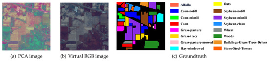 The Indian Pines dataset was collected in 1992 by the Airborne Visible/Infrared Imaging Spectrometer (AVIRIS) at the test site in northwestern Indiana. The dataset has a spatial dimension of 145 × 145 pixels with a spatial resolution of 20 m/pixel and a total of 220 wavelength reflection bands covering a wavelength range of 0.4–2.5 m with a nominal spectral resolution of 10 nm. After removing the influence band of noise and water absorption ([104–108], [150–163], 220), the remaining 200 bands were used for experiments. The scene is mainly agriculture and forests, including a small number of buildings. The dataset contains a total of 16 classes. The sample size varies greatly among classes, the minimum is only 20 and the largest class has 1428 samples. When selecting training samples, we selected according to the ratio of the total number of samples. In this experiment, we selected each class of 10% for training, and other samples for testing. The PCA first three components image, the virtual RGB image and the corresponding objects label map are as shown in Figure 3.