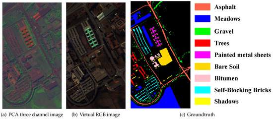 Pavia University dataset was taken in Pavia, Italy by the Reflective Optics System Imaging Spectrometer (ROSIS-3). The sensor has a total of 115 spectral channels covering a range of 0.43–0.86 m. After removing noise and water absorption bands, there were 103 hyperspectral bands remaining. The spatial dimension is 610 × 340, the spatial resolution is 1.3 m/pixel, and a total of 42,776 samples were included, containing nine types of ground objects such as grass, trees and asphalt. Since each type of labeled sample has a large amount, we chose 50 samples from each class to train and all remaining samples to test. In Figure 4, the three components image, the virtual RGB image and label of Pavia University are displayed.