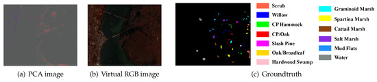 Kennedy Space Center (KSC) dataset was obtained in 1996 by the Airborne Visible/Infrared Imaging Spectrometer (AVIRIS) at the Kennedy Space Center (KSC). A total of 224 bands, covering the wavelength range of 0.4–2.5 m, the KSC dataset is available at a height of approximately 10 km with a spatial resolution of 18 m/pixel. After removing the water absorption and low SNR (Signal Noise Ratio) bands, there are 176 bands for analysis, including 13 objects coverage categories. The categories of the dataset are relatively balanced and the number is several hundred, so we used 20 samples of each type for training. Figure 5 shows the three-channel image by PCA, the virtual RGB image and the label map of KSC.