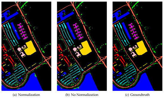 Table 4 demonstrated the accuracy and time-consumption of the three combination ways. When the two layer features are merged in the concatenation, the final feature dimension is very large, reaching 4896 dimensions, resulting in significant time-consumption in the process of upsampling bilinear interpolation. The memory footprint is more than 32 GB. Thus, we decided not to choose this combination mode when the classification result is equivalent. The main comparison is whether the normalization has an effect on the accuracy when the training samples are identical. We can see that the normalization addition is, relatively, a little inferior to the non-normalization direct addition on time consumption. In terms of classification effect, the normalization addition is better than the non-normalized. In Section 2.2 we also analyzed this method, because the method is implemented to make the contribution of two layers’ information the same, so we chose the method of normalization and addition. Figure 7 shows the results with and without normalization.